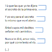 Matching Pairs LOS POEMASOnline version ESTA ACTIVIDAD TIENE COMO FINALIDAD QUE LOS ALUMNOS RELACIONEN CONCEPTOS DE MANERA CORRECTA, SOBRE EL TEMA LOS PEMAS. by NORMA ZUZETH MENESES RODRIGUEZ 1 2 ES LA REITERACIÓN O REPETICIÓN DE SONIDOS SEMEJANTES EN UN TEXTO O FRAGMENTO LITERARIO. 3 Enunciado o conjunto de palabras que forma una unidad en un poema, sujeto a ritmo y a medida determinados. 4 5 ESTROFA 6 METÁFORA 7 RIMA VERSO ES EL CONJUNTO DE VERSOS CUYA FORMA SE REPITE A LO LARGO DE UN POEMA, CON CARACTERÍSTICAS IGUALES. ALITERACIÓN POEMA 16 VERSOS
