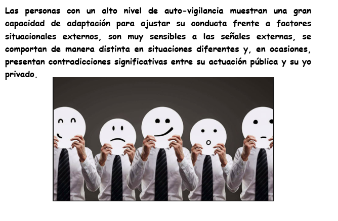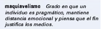 Otro rasgo de la personalidadOnline version Características de la personalidad. by Jinneth Romero 1 ¿Cuál es el lema de maquiavelismo? Escoge una o varias respuestas 2 ¿Cuál es el lema de maquiavelismo? Escoge una o varias respuestas a Hágalo usted b Contrólelo usted mismo c Si funciona úselo d Ninguna de las anteriores 3 ¿Se ha descubierto que los más maquiavélicos prosperan cuándo? Escoge una o varias respuestas a Interactúan cara a cara con otros, en vez de hacerlo en forma indirecta b La situación tiene un mínimo de reglas y regulaciones, lo que deja lugar para la improvisación c Las personas poco maquiavélicas se distraen porque se involucran emocionalmente con detalles que no son relevantes para gana d Todas las anteriores 4 Las características de la autoevaluación esencial son? Escoge una o varias respuestas a Responsabilidad, control del entorno, seguridad b Eficiencia, capacidad y control de su entorno c Personalidad, critica. Control del entorno 5 ¿Cómo describe el narcisismo al individuo? Escoge una o varias respuestas a sentido de su propia importancia b Admiración excesiva c Arrogancia d Todas las anteriores 6 La auto-vigilancia se refiere a la capacidad qué? Escoge una o varias respuestas a Comportamiento a factores situacionales externo b Comportamiento a tener ventajas sobre los demás c Control del comportamiento 7 ¿En la toma de riesgos, los individuos difieren en su voluntad para correr riesgos, y esto afecta el? Escoge una o varias respuestas a Tiempo y la información que necesitan para predecir un buen desempeño b Tiempo y la información que necesitan para tomar una decisión c Tiempo y la información que necesitan para ajustar su comportamiento d Ninguna de las anteriores 8 ¿ Los individuos que tienen una personalidad proactiva que rasgos identifican ? Escoge una o varias respuestas a Oportunidades b Iniciativa c Persistencia d Todas las anteriores Explicación 2 Características de la personalidad relevantes 3 Características de la personalidad relevantes 4 Características de la personalidad relevantes 5 Características de la personalidad relevantes 6 características de la personalidad relevantes 7 Características de la personalidad relevantes 8 características de la personalidad relevantes