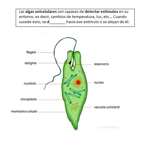 Las algas unicelulares y los protozoos responden con movimientos a e_______ ,como son los cambios en la luz, la temperatura y la salinidad del agua