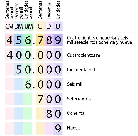 Los números naturales de 6 cifras se componen de Centenas de mil, Decenas de mil, Unidades de mil, Centenas, Decenas y Unidades.Para leer éstos números, primero separamos iniciando por la derecha los números en grupos de 3. Luego leemos teniendo en cuenta el valor de posición de cada una de las cifras.