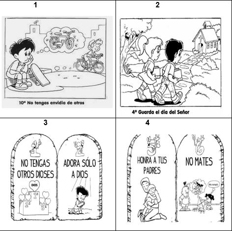 Evaluación D.Religión 3° 3POnline version Seleccione la opción correcta by Andec Ingeniería SAS 1 Observe las imágenes y responda las preguntas, Las imágenes de los Mandamientos que hacer relación a nuestro deber directamente con Dios son a 1 y 2 b 2 y 3 c 3 y 4 d 4 y 1 2 El primer dibujo de la imagen 4 nos dice que a Debemos desobedecer a nuestros padres b No escuchemos a nuestros padres c Les peguemos a nuestros padres d Amemos y obedezcamos a nuestros padres 3 La imagen número 1 hace referencia al Mandamiento que dice a No codiciar los bienes ajenos b Envidiar a los demás c No mentir d No robar 4 El dibujo de la imagen número 3 significa que a Debemos adorar otros dioses falsos b Debemos adorar a un solo Dios verdadero c Adoremos a otros ídolos. d No alabemos a Dios 5 Guarda el día del Señor significa que debemos a Ir a misa todos los domingos b Ir a cine el día del Señor c Olvidarnos de Dios d Dedicarnos solo a descansar