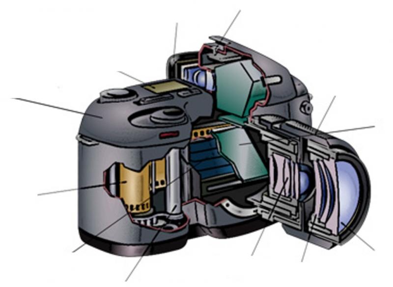 Partes de la cámaraOnline version Partes de la cámara by Carlos Lopez 1 Visor 2 Zapata Flash 3 anillos de enfoque 4 espejo 5 objeto 6 lentes 7 diafragma 8 arrastre de película 9 obturador 10 película 11 cuerpo 12 pantalla