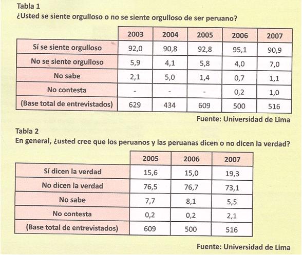 TEST CONTINUOS Y DISCONTINUOSOnline version COMPRENDE TEXTOS CONTINUOS Y DISCONTINUOS by Felix Mondragon 1 1. Básicamente, ¿sobre qué trata el texto? a a) El trabajo sacrificado de los árbitros. b b) El lamentable fanatismo de los hinchas. c c) El infausto papel de los árbitros. d d) El carácter injusto de las decisiones de un árbitro. e e) La desdichada vida de un árbitro. 2 2. Para los hinchas, el árbitro es: a a) un mal necesario. b b) la causa de todos sus problemas c c) un personaje despreciable. d d) un intruso en la cancha. e e) la razón de sus derrotas. 3 3. Con respecto al árbitro, ¿qué idea es incompatible? a a) La multitud concuerda cuando se trata de condenarlo. b b) No es habitual que sus decisiones coincidan con la voluntad del hincha. c c) Sus sentencias son inapelables. d d) Los fanáticos del fútbol valoran sin imparcialidad su papel. e e) Sus decisiones son correctas, dada su condición de juez. 4 4. En el último párrafo, el autor: a a) se burla del color del uniforme que vestían los árbitros antaño, pues es el mismo que se utiliza para el luto. b b) se solidariza con el noble y nunca bien ponderado hombre que ejerce el cargo en cuestión. c c) sugiere que el hecho de utilizar hoy un colorido uniforme, se debe a que el papel del árbitro está siendo un poco más valorado. d d) ironiza con la relación entre el color de la antigua vestimenta del árbitro y el odio que genera dicho personaje. e e) asegura que la forma actual de vestir del árbitro obedece a su afán por ocultar 5 5. ¿Cuál es el tema central de la Tabla 1? a a) Los peruanos. b b) El orgullo por Lima. c c) El orgullo por ser peruano. d d) El orgullo. e e) La evolución del amor por el Perú desde el 2003 hasta el 2007. 6 6. ¿Cuál seria el mejor título para la tabla 2? a a) Los peruanos y la falta de sinceridad b b) La mentira de los peruanos c c) Los peruanos son poco leales d d) Peruanos engañados e e) El Perú y la mentira 7 7. El responder "estoy muy bien, gracias" a la pregunta "¿cómo estás?": a a) es costumbre de los habitantes de cualquier país, excepto Perú. b b) no es propio del peruano promedio. c c) está en desuso a causa del pesimismo de los peruanos. d d) no tuvo acogida en este país de fatalistas. 8 8. Resulta concordante con el primer texto afirmar que: a a) los peruanos no le dan importancia a su situación económica. b b) Alonso Cueto es un ardiente defensor de la forma de hablar de los peruanos. c c) la frase "allí, pues" refleja realmente el estado de abandono del hablante. d d) al autor del texto le tomó un tiempo entender las connotaciones del habla peruana. e e) los peruanos no muestran abiertamente sus emociones. 9 9. Se entiende del segundo texto que: a a) los payasos son los únicos que pueden actuar en circos. b b) las personas que acuden a circos que incluyen animales están apoyando el maltrato hacia los mismos. c c) solo los payasos pueden ser maltratados, pues estos no pueden defenderse. d d) los circos no deben existir en ninguna de sus formas. e e) los payasos no son apreciados. 10 10. ¿Qué es lo que observamos en el segundo texto? a a) Un animal exótico. b b) Un león vestido de payaso. c c) Un león arreglado como payaso. d d) Un muñeco con forma de león. e e) Una acción lamentable e irremediable.