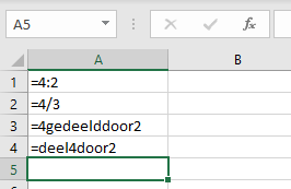 eenvoudige formulesOnline version eenvoudige formules by Joyce Van Mele 1 Hoe ziet de formule voor 2 + 2 eruit? Geschreven antwoord 2 Hoe formuleer je 4 gedeeld door 2? Kies één of meerdere antwoorden a =4:2 b =4/2 c =4gedeelddoor2 d =deel4door2 3 Waar kun je de notatie aanpassen? a uitlijning b getal c bewerken 4 Als ik enkel even cijfers wil in kolom A, moet ik dit dan manueel invoeren? a ja, je kan immers enkel doorvoeren zonder cijfers over te slaan. b Nee, je kan reeksen doorvoeren, dus ook telkens plus 2. 5 Door middel van welke formule bekom ik het product van A1 en B1? Zorg ervoor dat wanneer ik het getal in A1 wijzig, de formule nog steeds een correcte uitkomst geeft. Geschreven antwoord Uitleg 5 Ziezo, dat zit erop!