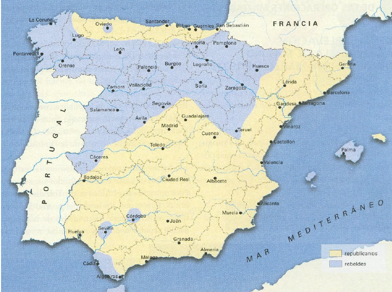 Guerra Civil EspañolaOnline version Mapa Interactivo sobre la Guerra Civil española by Jorge González Colmenarejo 1 Golpe de estado militar de Emilio Mola (18 de julio de 1936) 2 Golpe de estado militar de Cabanellas (18 de julio de 1936) 3 Golpe de estado militar de Queipo de Llano (18 de julio de 1936) 4 El ejercito de Africa pasa el Estrecho (5 de agosto de 1936) 5 Matanza de Badajoz (15 de agosto de 1936) 6 Asesinato de Federico García Lorca (19 de agosto de 1936) 7 Los nacionales toman Irún, aislando el norte republicano de la frontera francesa (5 de septiembre de 1936) 8 Liberación del Alcázar de Toledo (28 de septiembre de 1936) 9 Comienza la Batalla por Madrid (8 de noviembre de 1936) 10 El gobierno traslada la capital de la república a Valencia (Noviembre de 1936) 11 El CTV italiano inicia la campaña sobre Málaga (Enero de 1937) 12 Inicio de la batalla de Jarama (6 de febrero de 1937) 13 Batalla de Guadalajara (Marzo de 1937) 14 Legón Cóndor y la aviación italiana bombardean Guernika (25 de abril de 1937) 15 La CNT y el POUM se enfrentan al gobierno de la Generalitat en Barcelona (Mayo de 1937) 16 Campaña de Santander (Agosto de 1937) 17 El bando nacional toma Gijón (20 de octubre de 1937) 18 Batalla de Teruel (Enero de 1938) 19 Las tropas de franco toman Vinaroz (Abril de 1938) 20 Comienzo de la Batalla del Ebro (25 de julio de 1938) 21 Los exiliados pasan la frontera de La Junquera (Febrero de 1939) 22 Los últimos republicanos embarcan en Cartagena para el exilio (Marzo de 1939) 23 Franco nombrado Generalísimo y Jefe del Gobierno Nacional (29 de septiembre de 1936) 24 Golpe de estado militar de Aranda (18 de julio de 1936)