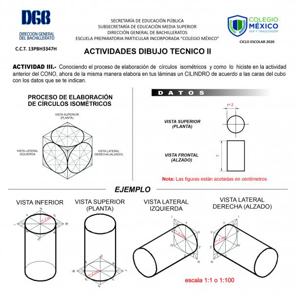 PREPA GRUPO 601 - DIBUJO IIOnline version TEMA: Perspectiva Isometrica. Construcción de cuerpos volumétricos con CIRCULOS ISOMETRICOS by Ivan Huerta Hern�ndez 1 Actividad III Realiza en tu block marquilla los ejercicios que se te indican. "Construcción de un Cilindro en sus diferentes posiciones Isométricas".Como lo hiciste en tu ejercicio anterior del CONO, poniendo en practica el método de construcción de Círculos Isométricos, ahora deberás elaborar un CILINDRO con el mismo procedimiento, con los datos que se dan y en sus diferentes posiciones de acuerdo a las caras del cubo que se te indica. 2 Actividad III 3 RECUERDA RECUERDA: UTILIZA TU COMPÁS y pon en practica el método para elaborar tus óvalos, no los hagas a mano alzada. Los ejercicios deben llevar medidas, cuida mucho tu precisión en el trazo y tu calidad y valor de línea.Esta(s) lámina(s) deberás enviarla(s) de forma digital el próximo día Jueves 2 de Abril, de 8:50 a 10:30 a.m. en horario habitual de clase.Al correo: colmexprepa.ivan@gmail.com; Con las especificaciones que se indican, (puedes tomar una foto en donde se vea el cuadro de datos COMPLETO, con tu nombre).Las láminas físicas deberán ser entregadas al regreso a clases. 4 INDICACIONES POR FAVOR CHAVOS MANDEN SUS LÁMINAS COMO SE INDICAN EVITENCE TRABAJAR DOBLE Y ESTAR HACIENDO CORRECCIONES.