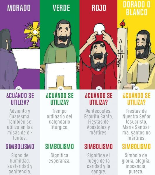 Tiempos litúrgicosOnline version Vamos a recordar los colores de los tiempos litúrgicos y que significa cada uno. by Catequesis Batallón 3 1 Acá esta el repaso de los colores.. Los recordas? a NO b SI 2 Qué color se usa en: ADVIENTO (1/12/19 al 22/12/19) a ROJO b VERDE c BLANCO O DORADO d MORADO 3 Qué color se usa en: NAVIDAD y REYES (25/12/19 al 12/01/20) a ROJO b VERDE c BLANCO O DORADO d MORADO 4 Qué color se usa en: 1er TIEMPO ORDINARIO (13/01/20 al 25/02/20) a ROJO b VERDE c BLANCO O DORADO d MORADO 5 Qué color se usa en: CUARESMA (26/02/20 al 08/04/20) a ROJO b VERDE c BLANCO O DORADO d MORADO 6 Qué color se usa en: PASCUA (12/04/20 al 30/05/20) a ROJO b VERDE c BLANCO O DORADO d MORADO 7 Qué color se usa en: SEMANA SANTA (9 y 10/05/20) Y PENTECOSTÉS (31/05/20) a ROJO b VERDE c BLANCO O DORADO d MORADO 8 Qué color se usa en: 2do TIEMPO ORDINARIO (01/06/20 al 28/11/20) a ROJO b VERDE c BLANCO O DORADO d MORADO