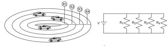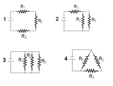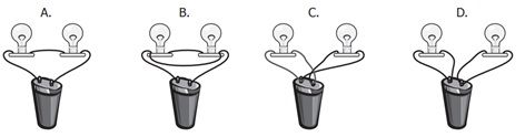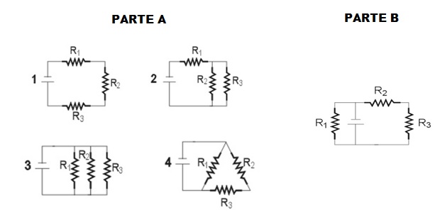 Pre-Test ELECTROMAGNETISMOOnline version Se evaluará los conceptos básicos de electromagnetismo by aura licia hidalgo martinez 1 Una batería y tres bombillos se conectan como se ilustra en la figura. Los tres bombillos son idénticos. Respecto a la intensidad luminosa (brillo) de los bombillos es correcto afirmar que a la intensidad luminosa de A es mayor que la de B y la de B es mayor que la de C b las intensidades luminosas de B y C son mayores que la de A c las intensidades luminosas de B y C son iguales y menores que la de A d las intensidades luminosas de A y B son iguales y mayores que la de C 2 Una batería y tres bombillos se conectan como se ilustra en la figura. Con relación a la diferencia de potencial entre los bornes de los bombillos, es correcto afirmar que en a A es mayor que en B y C b Los tres bombillos son iguales c B es mayor que en A y C d B y C son mayores que en A 3 Una batería y tres bombillos se conectan como se ilustra en la figura .El cable que va del bombillo A al C se corta en el punto 1. con relación a la nueva situación, es correcto afirmar que a La intensidad luminosa del bombillo B aumenta y su diferencia de potencial permanece igual b La intensidad luminosa del bombillo A aumenta y su diferencia de potencial aumenta c Las intensidades luminosas de los bombillos A y B aumentan y sus diferencias de potencial aumentan d La intensidad luminosa del bombillo B aumenta y su diferencia de potencial aumenta 4 Se tienen tres resistencias iguales dispuestas en diferentes configuraciones como se ve en las figuras, alimentadas por fuentes iguales. La configuración en la cual la fuente suministra mayor corriente es la indicada con él numero a 1 b 2 c 3 d 4 5 Se tienen tres resistencias iguales dispuestas en diferentes configuraciones como se ve en las figuras en la parte A, alimentadas por fuentes iguales. De los esquemas de la parte A, el que es equivalente al esquema de la parte B es él a 1 b 2 c 3 d 4 6 Un muñeco metálico con brazos móviles se construyó con papel aluminio, alambre y corcho, como se ilustra en la figura. Un muñeco cargado negativamente se une a otro muñeco descargado y luego se separan. De esta situación se puede afirmar que: a El muñeco cargado se descarga, cargando al muñeco descargado b El muñeco descargado, descarga al primer muñeco, quedando ambos neutros. c Un muñeco queda cargado positivamente y el otro negativamente d Ambos muñecos quedan cargados negativamente 7 Un estudiante dispone de dos bombillos, dos roscas para bombillo, una pila y alambre suficiente. El desea construir un circuito en el cual la pila mantenga los dos bombillos encendidos por el mayor tiempo posible. De los siguientes circuitos, aquel que cumple esta condición es a a b b c c d d 8 En una pista circular de juguete hay cuatro carros que se desplazan con rapidez constante. Todos los carros tardan el mismo tiempo en dar una vuelta completa a la pista. Las resistencias R1, R2, R3 y R4 de cada uno de los carros son iguales, y su valor es R. La pista está alimentada por una pila que entrega un voltaje V. La pista con los carros en movimiento se representa mediante el esquema simplificado del circuito eléctrico mostrado en la figura. La magnitud de la aceleración de cualquiera de los carros en cualquier momento es: a Igual a cero, porque la magnitud de su velocidad es constante. b Igual a cero, porque la magnitud de la fuerza neta sobre el carro es nula c Diferente de cero, porque la magnitud de la velocidad angular no es constante d Diferente de cero, porque la dirección de la velocidad no es constante. 9 En una pista circular de juguete hay cuatro carros que se desplazan con rapidez constante. Todos los carros tardan el mismo tiempo en dar una vuelta completa a la pista. Las resistencias R1, R2, R3 y R4 de cada uno de los carros son iguales, y su valor es R. La pista está alimentada por una pila que entrega un voltaje V. La pista con los carros en movimiento se representa mediante el esquema simplificado del circuito eléctrico mostrado en la figura. Una forma de verificar que las resistencias R1, R2, R3 y R4 están en paralelo es: a Al medir el voltaje en cada resistencia, debería ser igual a V en R1 y cero en las otras b Al medir el voltaje a través de cada resistencia debería ser el mismo para todas c Al medir la corriente, debería ser mayor a través de la primera resistencia R1 d Al medir la corriente debería ser mayor a través de la última resistencia R4.