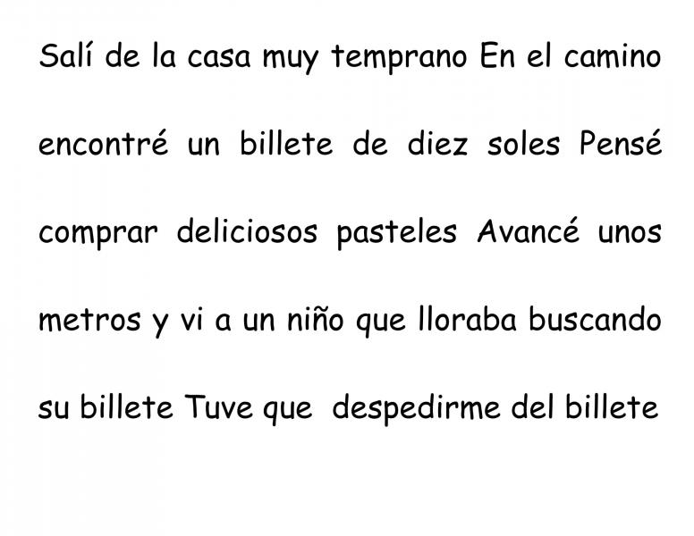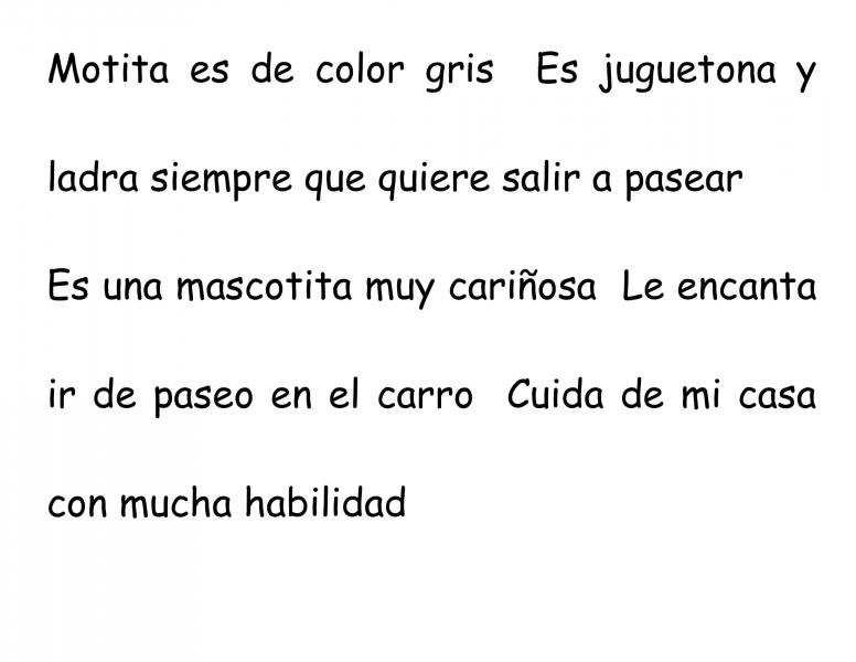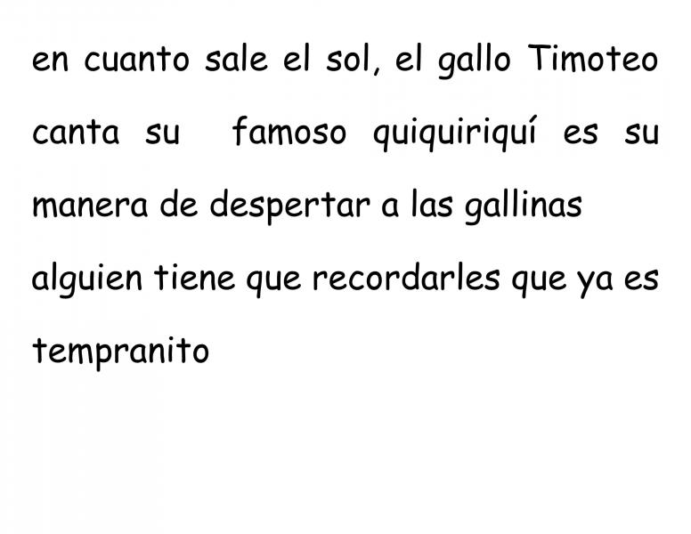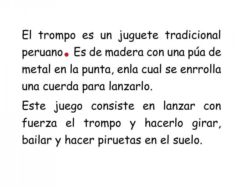 Uso del puntoOnline version Identificar los distintos tipos de puntos. by Yuly Méndez Con Los Niños 1 En el siguiente texto ¿cuántos puntos faltan? a 4 b 5 c 6 2 En el siguiente texto ¿cuántos puntos faltan? a 3 b 4 c 5 3 Lee atentamente el siguiente texto, date cuenta dónde faltan puntos y las mayúsculas. Dime ¿cuántas faltan? a 3 puntos - 3 mayúsculas b 4 puntos - 3 mayúsculas c 3 puntos - 4 mayúsculas 4 En el siguiente texto el punto resaltado se llama... a Punto y seguido b Punto y aparte c Punto final 5 En el siguiente texto el punto resaltado se llama... a Punto y seguido b Punto y aparte c Punto final 6 En el siguiente texto el punto resaltado se llama... a Punto y seguido b Punto y aparte c Punto final Explicación 1 Salí de la casa muy temprano. En el camino encontré un billete de diez soles. Pensé comprar deliciosos pasteles. Avancé unos metros y vi a un niño que lloraba buscando su billete. Tuve que despedirme del billete. 2 Motita es de color gris. Es juguetona y ladra siempre que quiere salir a pasear. Le encanta ir de paseo en el carro. Cuida de mi casa con mucha habilidad. 3 En cuanto sale el sol, el gallo Timoteo canta su famoso quiquiriquí. Es su manera de despertar a las gallinas. Alguien tiene que recordarles que ya es tempranito. 4 El punto rojo que observamos se llama punto y seguido. Recordemos que un punto y seguido se coloca cuando la oración termina dentro de un párrafo. 5 El punto rojo que observamos se llama punto final. Recordemos que un punto final se coloca cuando el texto se terminó; cierra el texto. 6 El punto rojo que observamos se llama punto y aparte. Recordemos que un punto y aparte separa dos párrafos con ideas diferentes. Cuando el párrafo terminó y luego continúa otro.