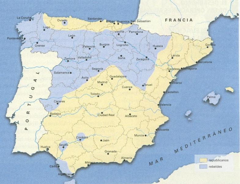 La Guerra Civil EspañolaOnline version Mapa interactivo sobre la Guerra Civil Española by Marina Siguero Hernanz 1 Julio 18, 1936. Golpe de estado militar de Emilio Mola. 2 Julio 18, 1936. Golpe de estado militar de Cabanellas. 3 Julio 18, 1936. Golpe de estado militar de Aranda. 4 Julio 18, 1936. Golpe de estado militar de Queipo de Llano. 5 Agosto 5, 1936. El ejercito de Africa pasa el Estrecho. 6 Agosto 15, 1936. Matanza de Badajoz. 7 Agosto 19, 1936. Asesinato de Federico García Lorca. 8 Septiembre 5, 1936. Los nacionales toman Irún, aislando el norte republicano de la frontera francesa. 9 Septiembre 28, 1936. Liberación del Alcázar de Toledo. 10 Septiembre 29, 1936. Franco nombrado Generalísimo y Jefe del Gobierno Nacional. 11 Noviembre 8, 1936: Comienza la Batalla por Madrid. 12 Noviembre, 1936. El gobierno traslada la capital de la república a Valencia. 13 Enero, 1937. El CTV italiano inicia la campaña sobre Málaga. 14 Febrero 6, 1937. Inicio de la batalla de Jarama. 15 Marzo, 1937. Batalla de Guadalajara. 16 Abril 25, 1937. La Legión Cóndor y la aviación italiana bombardean Guernica. 17 Mayo, 1937. La CNT y el POUM se enfrentan al gobierno de la Generalitat en Barcelona. 18 Agosto de 1937. Campaña de Santander. 19 Octubre 20, 1937. El bando nacional toma Gijón. 20 Enero, 1938. Batalla de Teruel. 21 Abril, 1938. Las tropas de franco toman Vinaroz. 22 Julio 25, 1938. Comienzo de la Batalla del Ebro. 23 Febrero, 1939. Los exiliados pasan la frontera de La Junquera. 24 Marzo, 1939. Los últimos republicanos embarcan en Cartagena para el exilio.
