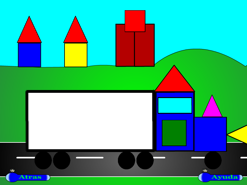 Las objetos y las figuras Online version Con la ayuda de un adulto lee las preguntas y señala las respuestas, así aprenderás las figuras geométricas. by PAULA ANDREA ZULUAGA JARAMILLO 1 Dale clic a los triángulos rojos 2 Dale clic al cuadrado verde 3 Señala el rectángulo más grande del dibujo 4 Y las llantas del camión. Señala 1 llanta 5 Da clic al cuadrado del color del sol 6 Parece una puerta, Señala el rectángulo rojo 7 Abre muy bien los ojos y busca el triángulo amarillo 8 Señala la figura que tiene el mismo color del cielo 9 El cuadrado más grande del camión es... 10 La montaña verde a que figura se parece?