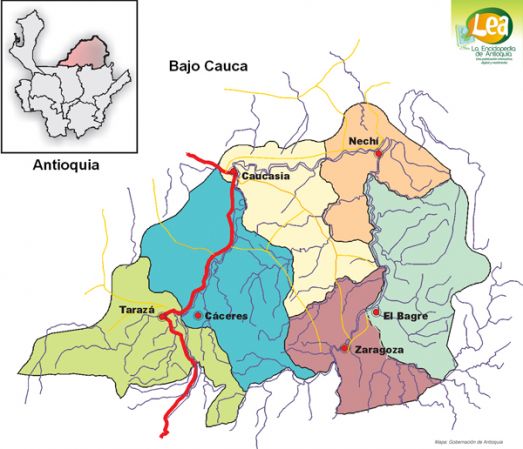 Mapa de ColombiaOnline version Comunidades Bajo Cauca by Natalia Martinez Ospina 1 Nechi 2 El Bagre 3 Zaragoza 4 Caceres 5 Caucasia 6 Taraza