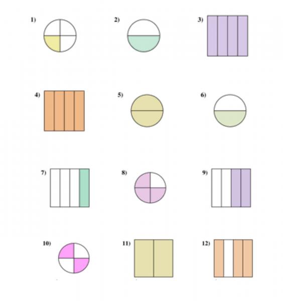 FraccionesOnline version Ubica las fracciones que se te solicitan by Jimena AC 1 1/2 un medio color azul 2 1/4 un cuarto color amarillo 3 2/4 dos cuartos color morado 4 4/4 cuatro cuartos color morado 5 4/4 cuatro cuartos naranja 6 1/4 un cuarto color azul 7 3/4 tres cuartos color morado 8 2/4 dos cuartos color rosa 9 2/2 dos medios en un rectángulo 10 2/2 dos medios en un círculo 11 1/2 un medio color verde
