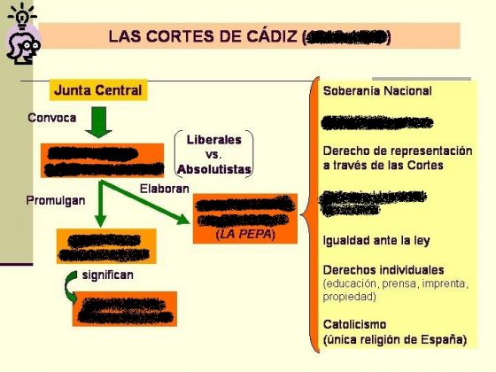 Las cortes de CádizOnline version Esquema sobre las Cortes de Cádiz. by Ana Sánchez 1 CONSTITUCIÓN DE 1812 2 División de poderes 3 DECRETOS REFORMISTAS 4 1810-1812 5 Abolición del Antiguo Régimen 6 Sufragio Universal Masculino 7 CORTES CONSTITUYENTES