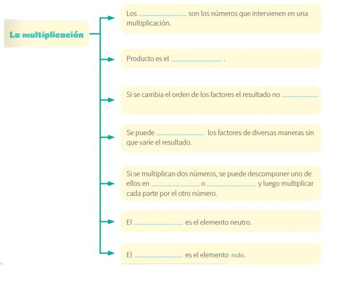 Multiplicación ¿ Qué aprendí?Online version Completa el siguiente esquema organizando todo lo que aprendiste sobre la multiplicación. by Melanie Rabino 1 factores 2 resultado 3 cambia. 4 agrupar 5 suma 6 resta 7 uno 8 cero