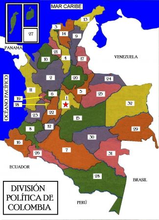 MAPA POLÍTICO DE COLOMBIAOnline version Ubica los Departamentos de Colombia by PAHOLA JARAMILLO GIRALDO 1 Guajira 2 Amazonas 3 Cundinamarca 4 Arauca 5 Chocó 6 Antioquia 7 San Andrés 8 Bolívar 9 Vichada 10 Putumayo 11 Naariño 12 Tolima 13 Risaralda 14 Caldas 15 Quindío