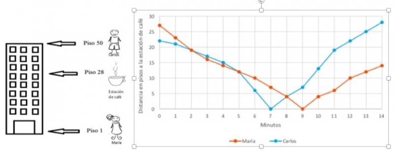 Carlos y Maria trabajan en un edificio de 50 pisos que cuenta con una estación de café en el piso 28. Observa la figura: Carlos se encuentra en el piso 50 y debe ir al piso 1. Maria se encuentra en el piso 1 y debe ir al pisó 50, para hacer ejercicio los dos deciden utilizar la escalera. Los dos empiezan el recorrido al tiempo. La gráfica muestra la distancia ( en número de pisos) a la que se encuentra cada uno de la estación de café al transcurrir los minutos. Si hay una sola escalera para subir y bajar, ¿En qué momento se cruzaron Carlos y María?