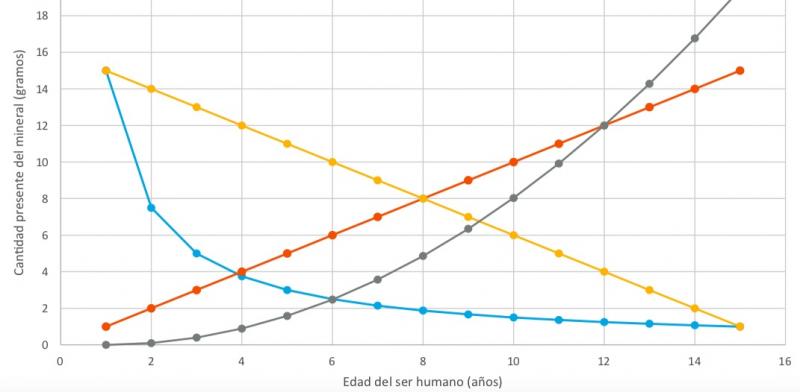 En la figura se muestra la concentración de distintos minerales en el cuerpo humano dependiendo de la edad. Observa la gráfica y determina ¿Para cuál de los minerales del gráfico, la relación es directamente proporcional con la edad?
