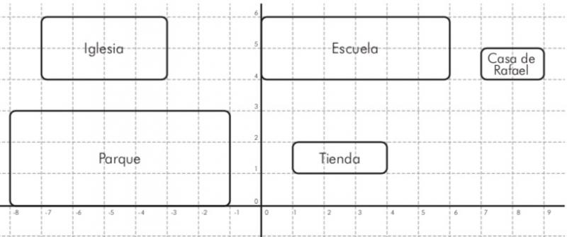 Rafael camino una cuadra al occidente para llegar a la escuela. Observa el mapa. Al terminar la jornada escolar, camina tres cuadras al sur y 8 cuadras al occidente, ¿a qué lugar llegó Rafael después de haber salido de la Escuela?