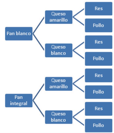 En diagrama muestra las opciones de hamburguesa que hay en una tienda de comidas rápidas. Isabel quiere su hamburguesa con queso amarillo, ¿cuántas opciones de hamburguesas diferentes tiene ella para que su hamburguesa tenga el queso que le gusta?