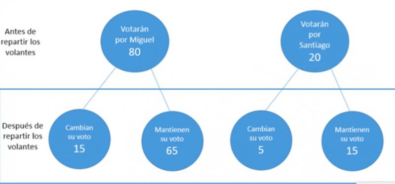 Santiago y Miguel son los candidatos a personero del colegio. Santiago cree que si entrega volantes con sus propuestas a los 100 estudiantes que pueden votar, entonces aumentará el número de estudiantes que votará por él. La figura muestra la cantidad de estudiantes que votará por cada candidato y los que cambian de decisión después de recibir los volantes. Respecto a la consideración de Santiago, de que aumentará el número de estudiantes que votan por él, se puede decir que: