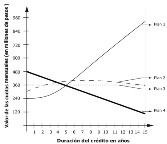 Para adquirir una casa nueva de 24 millones de pesos por medio de un préstamo a 15 años, existen diferentes planes de crédito, Cuatro de ellos se presentan en la siguiente gráfica, ¿Cuál es el plan que tiene la cuota más alta después del año 8?