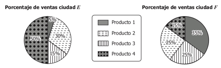 Una comercializadora vende cuatro clases de productos en dos ciudades. Durante una semana vendió 1200 unidades de estos productos en la ciudad E y 800 unidades en la ciudad F. Las siguientes gráficas muestran los porcentajes de ventas en las dos ciudades. ¿Cuántas unidades del producto 2 fueron vendidas, en total, en la ciudad E?