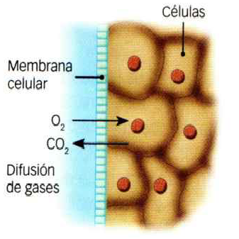 Respiración directa. Se produce a través de las membranas de las células en la superficie del organismo. El oxígeno y el dióxido de carbono se transporta por difusión (forma de intercambio celular que no requiere energía). Esta respiración es realizada por los poríferos y los cnidarios.