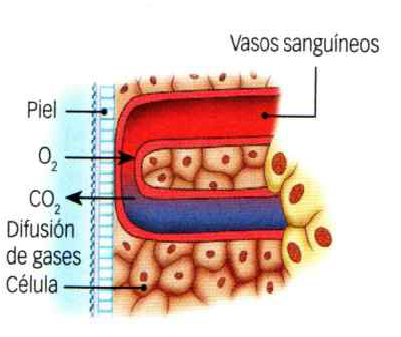 Respiración cutánea. Se realiza a través de la piel, que es muy fina y húmeda, con numerosos vasos sanguíneos situados en la superficie para facilitar el intercambio de gases. Esta respiración se presenta en los gusanos y en los anfibios en estado adulto, aunque en estos últimos se completa con la respiración pulmonar.