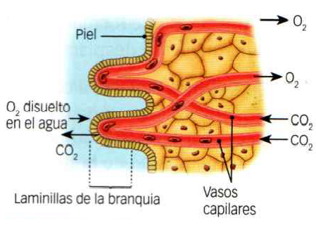 Respiración branquial. Se produce a través de las branquias o agallas, que están constituidas por una serie de laminillas que contienen muchos vasos sanguíneos en los que ocurre el intercambio gaseoso. Esta respiración es propia de animales acuáticos, como algunos anélidos, moluscos, crustáceos, equinodermos, larvas de anfibios y peces.