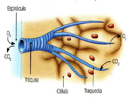 Respiración traquealEs característica de artrópodos terrestres (insectos, arácnidos y miriápodos) Se realiza por tráqueas, unos tubos ramificados que llegan prácticamente a todos los órganos del animal. Estos conductos se abren hacia el exterior por unos orificios llamados espiráculos, que se encuentran situados a lo largo de la superficie del cuerpo, por donde penetra y sale el aire