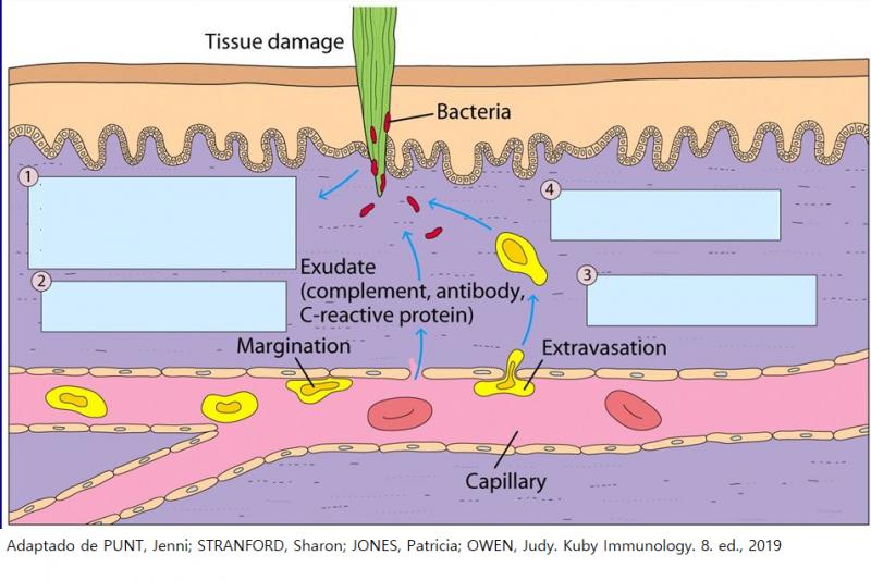 Mecanismos de inflamaçãoOnline version Localize na figura a sequencia de eventos que promovem a inflamação by Eleonora Picoli 1 Dano tecidual causa a liberação de mediadores vasoativos e quimiotáxicos que aumentam o fluxo sanguíneo e a permeabilidade vascular no local 2 O aumento da permeabilidade vascular aumenta o influxo de fluidos (liberação de exudato) que contribuirá para a formação do edema e também a migração de células sanguíneas (diapedese) 3 Células de fagocitose migram para o local da lesão graças a liberação de fatores quimiotáxicos 4 Ocorre a fagocitose das bactérias e restos teciduais. Haverá também a liberação de fatores de crescimento celular que estimularão a mitose e permitirão a regeneração tecidual 5 Neutrófilos e Macrófagos 6 Diapedese 7 Aumento da permeabilidade vascular