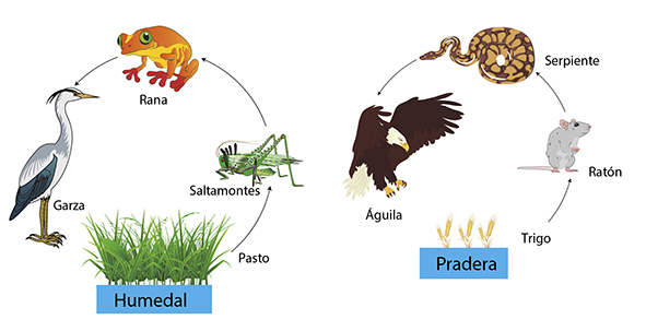Las siguientes imágenes representan dos cadenas tróficas que dibujó un biólogo, luego de su última salida de campo a dos ecosistemas presentes en su región. De acuerdo con las imágenes, ¿cuáles organismos representan los consumidores secundarios en las cadenas tróficas del humedal y la pradera?