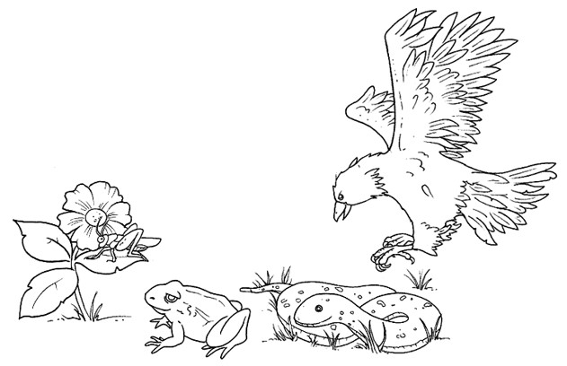 En la cadena alimenticia: Hierba, saltamontes, araña , sapo , culebra , halcón , bacteria. El sapo es