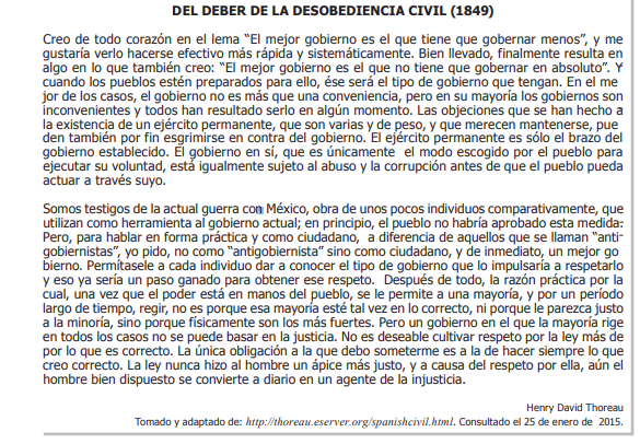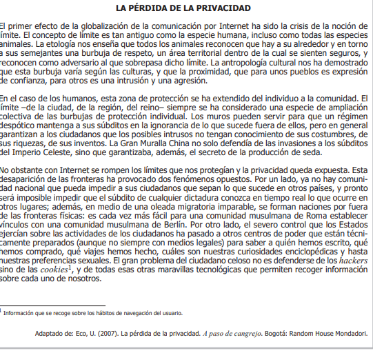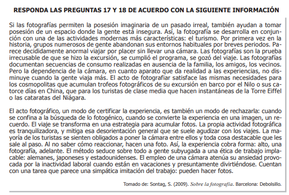 PRUEBA SABER LECTURA CRÍTICAOnline version UTILIZA TUS CONOCIMIENTOS PARA DESARROLLAR ESTA ACTIVIDAD Y TEN EN CUENTA LOS NIVELES DE LECTURA Y LAS COMPETENCIAS PROPIAS DEL ÁREA. by Elizabeth Leyton 1 ¿Cuál de los siguientes es un ejemplo que menciona el autor para apoyar su posición frente a los Gobiernos? a La guerra con México. b Los abusos del ejército. c La tiranía de las mayorías. d La debilidad de las minorías 2 ¿Cuál de los siguientes enunciados sintetiza mejor el contenido del primer párrafo? a Una profunda tradición intelectual ha configurado el concepto de límite como el espacio de defensa que crean los seres a su alrededor. b Internet ha generado cambios en el concepto tradicional de límite, tal como lo define la etología y la antropología. c Por naturaleza los seres vivos exigen el respeto del propio espacio, y esto aplica incluso para las relaciones que se dan en Internet. d Los estudios de la etología y la antropología nos permiten comprender por qué Internet vulnera la intimidad de las personas. 3 En el tercer párrafo, cuando el autor menciona a las naciones que se forman fuera de las fronteras físicas, hace referencia a a los individuos de una misma cultura que viven en territorios diferentes. b la fluencia migratoria que genera el amplio número de turistas. c el encuentro virtual de personas de pensamientos diferentes. d las comunidades virtuales que se crean en el ciberespacio. 4 En la frase “Las fotografías son la prueba irrecusable de que se hizo la excursión, se cumplió el programa, se gozó del viaje”, ¿cuál de las siguientes palabras es un sinónimo de la palabra ‘irrecusable’? a Inminente. b Concluyente c Irremplazable. d Cuestionable. 5 Considere el siguiente resumen del texto anterior: “La autora analiza la relación entre el turismo y la fotografía, teniendo en cuenta que los cos- mopolitas ven en sus viajes al acto de fotografiar como una necesidad. Según ella, ese acto acaba por convertirse en una práctica trivial con la que solo se busca mitigar la desorienta- ción general que causan los viajes. Así, la fotografía se convierte para los cosmopolitas japo- neses, estadounidenses y alemanes en una especie de reemplazo del trabajo al que están acostumbrados”. El anterior resumen se puede describir como inadecuado porque a expone ideas contrarias a las afirmaciones principales del texto. b se centra en un tipo particular de turistas y no en los turistas en general. c omite el tono irónico y burlón con que la autora se refiere al arte de la fotografía. d se detiene en presentar información en extremo detallada y secundaria del texto.