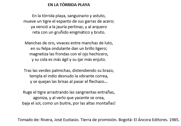 EN LA TÓRRIDA PLAYAOnline version Adaptado de https://orientacion.universia.net.co/imgs2011/imagenes/ejemplos-d-2016_10_31_163012.pdf Responde las preguntas 1 al 5 de acuerdo con el siguiente texto: by Yirley Tatiana Rodriguez Castillo 1 En el texto se habla principalmente de la a angustia de un tigre. b cacería de un tigre. c descripción de un animal. d agilidad de un animal. 2 Si ser modernista significa huir en el tiempo y el espacio de una realidad habitual, entonces los versos de Rivera son modernistas porque a dibujan la realidad tal cual se ve. b rechazan la realidad cotidiana al evocar espacios exóticos. c abandonan la naturaleza y exaltan la ciudad. d muestran la intimidad del hombre. 3 En el poema, con la expresión como “Manchas de oro, vivaces entre manchas de luto” se busca a presentar el paisaje en el que vive el animal. b revelar el carácter fantástico del animal. c describir el color del pelaje del tigre. d expresar el parecido entre el buitre y el tigre. 4 La forma poética que estructura al texto es a cuatro estrofas de un cuarteto y tres tercetos. b cuatro estrofas de tres tercetos y un cuarteto. c cuatro estrofas de dos tercetos y un cuarteto. d cuatro estrofas de dos cuartetos y dos tercetos. 5 El esquema que mejor representa la organización de las ideas en el texto es: a Descripción de escenario, caracterización del tigre,acciones del indio y muerte del tigre. b Caracterización del tigre, acciones del indio, descripción de escenario y muerte del tigre. c Descripción del escenario, acciones del indio, muerte del tigre y caracterización del tigre. d Caracterización del tigre, descripción del escenario, acciones del indio y muerte del tigre.