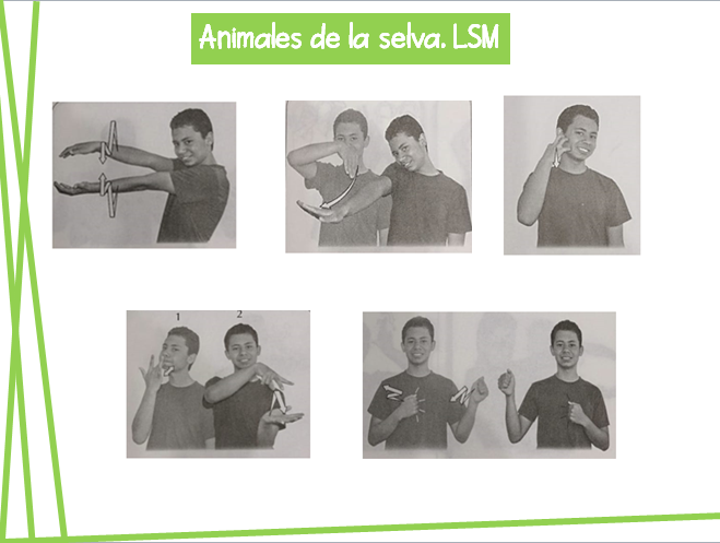 Animales de la selva. LSMOnline version Juego para practicar el vocabulario de los animales de la selva en Lengua de Señas Mexicana. by Estefanía Herrera Caldera 1 ¿Cuál es la seña de cocodrilo? 2 ¿Cuál es la seña de elefante? 3 ¿Cuál es la seña de tigre? 4 ¿Cuál es la seña de rana? 5 ¿Cuál es la seña de gorila?